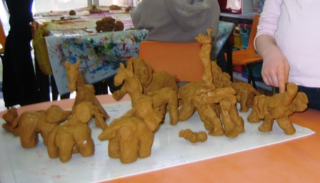 L’artiste angevine Lulu Balladart est venue dans notre classe, avec de la terre du Fuilet, pour faire du modelage avec nous. Elle a d’abord écouté les enfants lui raconter l’histoire que l’on a inventé pour le concours « Nos livres d’enfants », puis elle a demandé quels animaux vivaient en Afrique. On a énuméré ceux qu’on connaît et elle nous a montré que pour les modeler, il faut faire deux boules, pour la tête et le corps, les coller en appuyant et en faisant glisser la terre, puis rajouter des pattes. On peut prendre des outils pour les yeux, les griffes, etc., mais c’est mieux de travailler avec ses mains. « C’est sale ! » ont dit certains enfants. « Non, la terre est très propre, a répondu Lulu, il faut juste se laver les mains après. Mais la terre ne donne pas de maladies. »