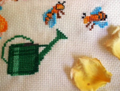 Le dessin de l'arrosoir et ses nuances de verts lui plaisaient tout particulièrement. Elle a donc commencé le travail d'aiguille avec lui. Un très bel objet, vraiment, pour sa forme et son utilité !
