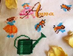 Le printemps suivant, elle a décidé de réaliser un coussin avec des motifs commençant tous par la lettre A, comme le prénom de sa plus jeune fille. Dessiner l'ensemble du décor, à l'aide d'une encyclopédie de la broderie, a été un joli moment de créativité et d'élan. Vraiment super !
