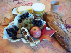 Jolie mais difficile à manger sans tout faire vaciller , non ?! Donc je suppose qu'on commence par manger le raisin et les noix et noisettes avec les mains avant de croquer à pleines dents dans le pain .