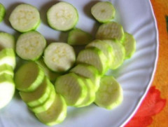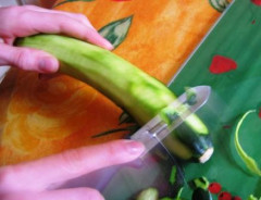 - Ensuite laver et éplucher les courgettes en gardant une lanière de peau sur deux. (Cela donne de belles variations de couleur à la soupe, mais mon ado, cette fois-ci, ne l'a pas fait !)