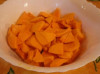Pelez le potiron et coupez-le par la moitié. Puis enlevez avec une cuillère les fibres et les pépins et coupez la chair en gros dés.