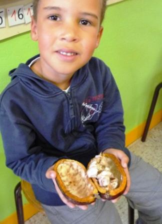 Vous distinguez les petites fèves à l'intérieur, reliées entre elles par des fibres blanches ... Légèrement amères, on peut les sucer, les croquer, mais elles n'ont pas la saveur d'un délicieux petit œuf en chocolat. Normal ! Elles doivent subir pour cela de nombreuses transformations, qui sont clairement expliquées sur ce site.