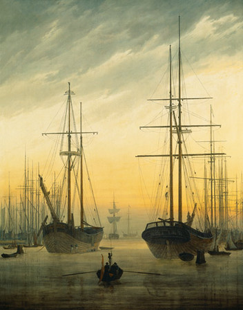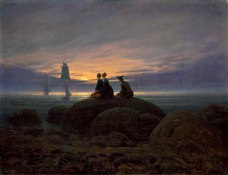 Un bonheur particulier à contempler la toile suivante, "Sur le voilier", conservée au musée de l'Ermitage à Saint-Pétersbourg. Caspar Friedrich vient d'épouser, en 1818, Caroline Boomer. Au retour de leur voyage de noce, sur les bords de la Baltique et dans l'ile de Rügen, il va représenter leur couple sur cette toile magnifique, commentée par Christophe André, dans "De l'art du bonheur":