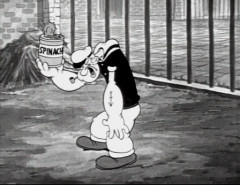 Popeye tenant sa fameuse boîte d'épinards dans Little Swee' Pea. Allez-y voir, c'est rigolo !