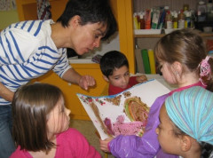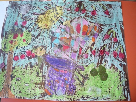 Cette artiste-pédagogue se révèle également amusante et drôlement sympa ! Les lutins rigolent et, dans un joyeux brouhaha, ils collent dans leur "jardin" des fleurs, des feuilles, qu'ils avaient fait sécher auparavant. Une belle harmonie de couleurs, vous ne trouvez pas ?!