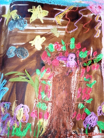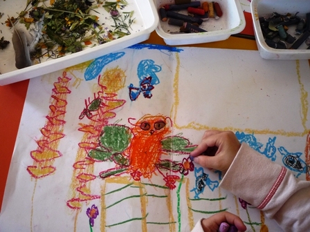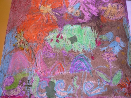 Au bout de trois-quart d'heure, environ, les lutins se lancent au pastel gras sur un grand Canson. Peu d'hésitation. Les couleurs se juxtaposent, bestioles et légumes entrent en scène, l'espace blanc de la feuille devient "jardin", "potager", qu'ils organisent librement, mais avec talent !
